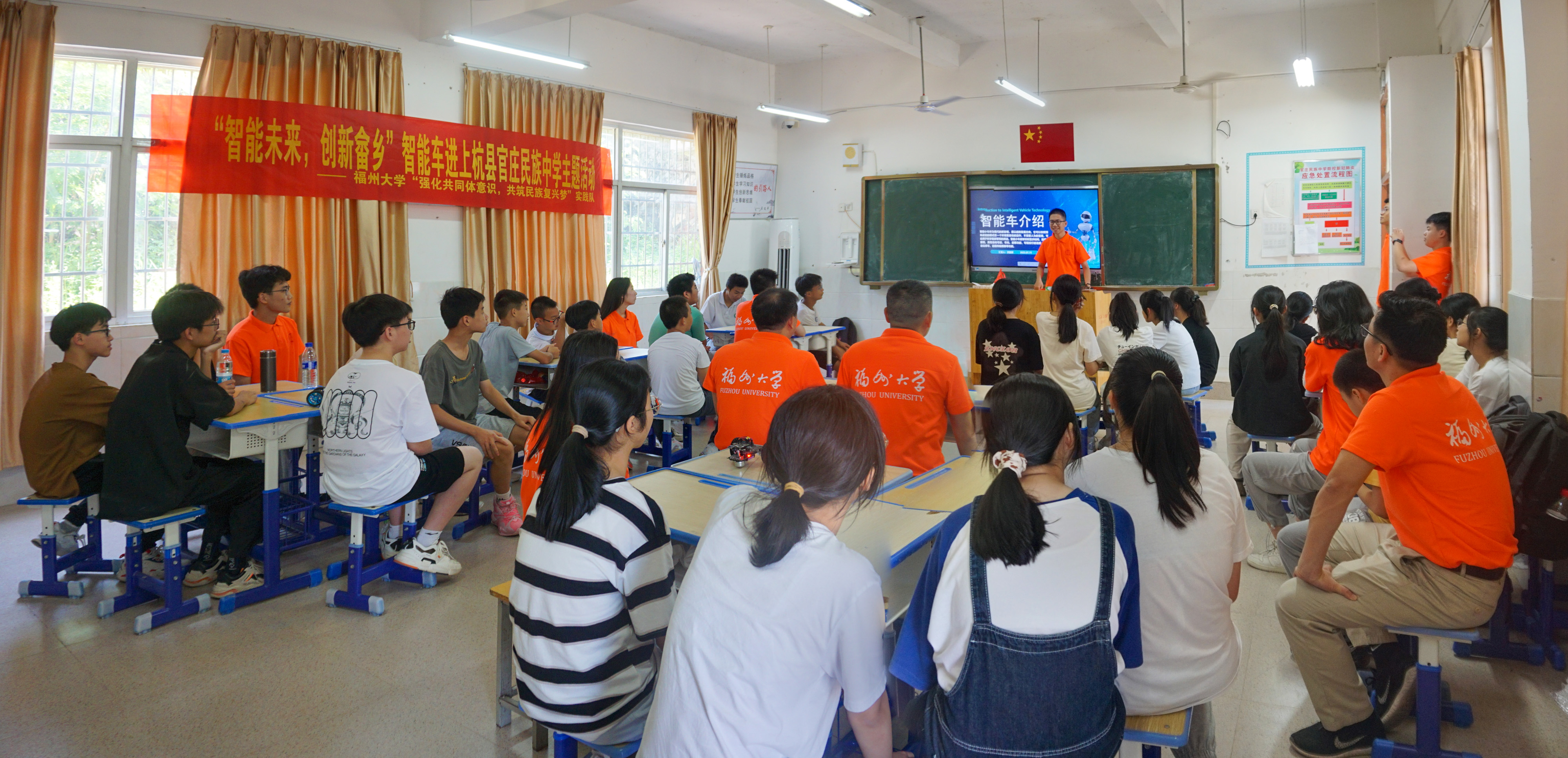 实践感受智能车之神奇。“智能未来,创新畲乡”智能车进上杭县官庄民族中学主题活动在上杭县官庄民族中学多媒体教室顺利开展。实践队队员们发挥专业特长,为当地少数民族学生讲解智能车的组成构造、工作原理、编程调试以及使用方法,并介绍了无人机、机器人等人工智能产品的发展动态。同学们充满好奇,听得津津有味,并在实践队员的引导下分组进行智能车调试。智能车语音控制、手势控制、蓝牙遥控……新奇的体验让同学乐在其中,教室里充满欢声笑语。