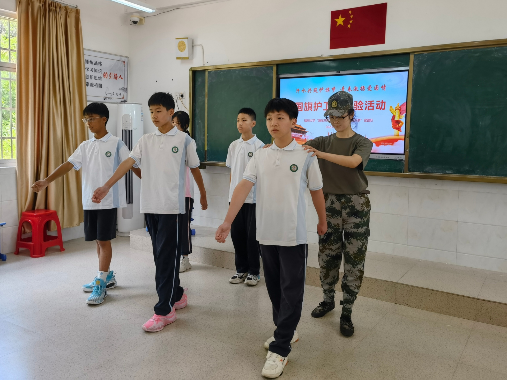 实践队在上杭县官庄民族中学开展主题为“汗水共筑护旗梦,青春激扬爱国情”的国旗护卫队体验活动,为当地少数民族学生们带来一堂生动的爱国主义教育课。