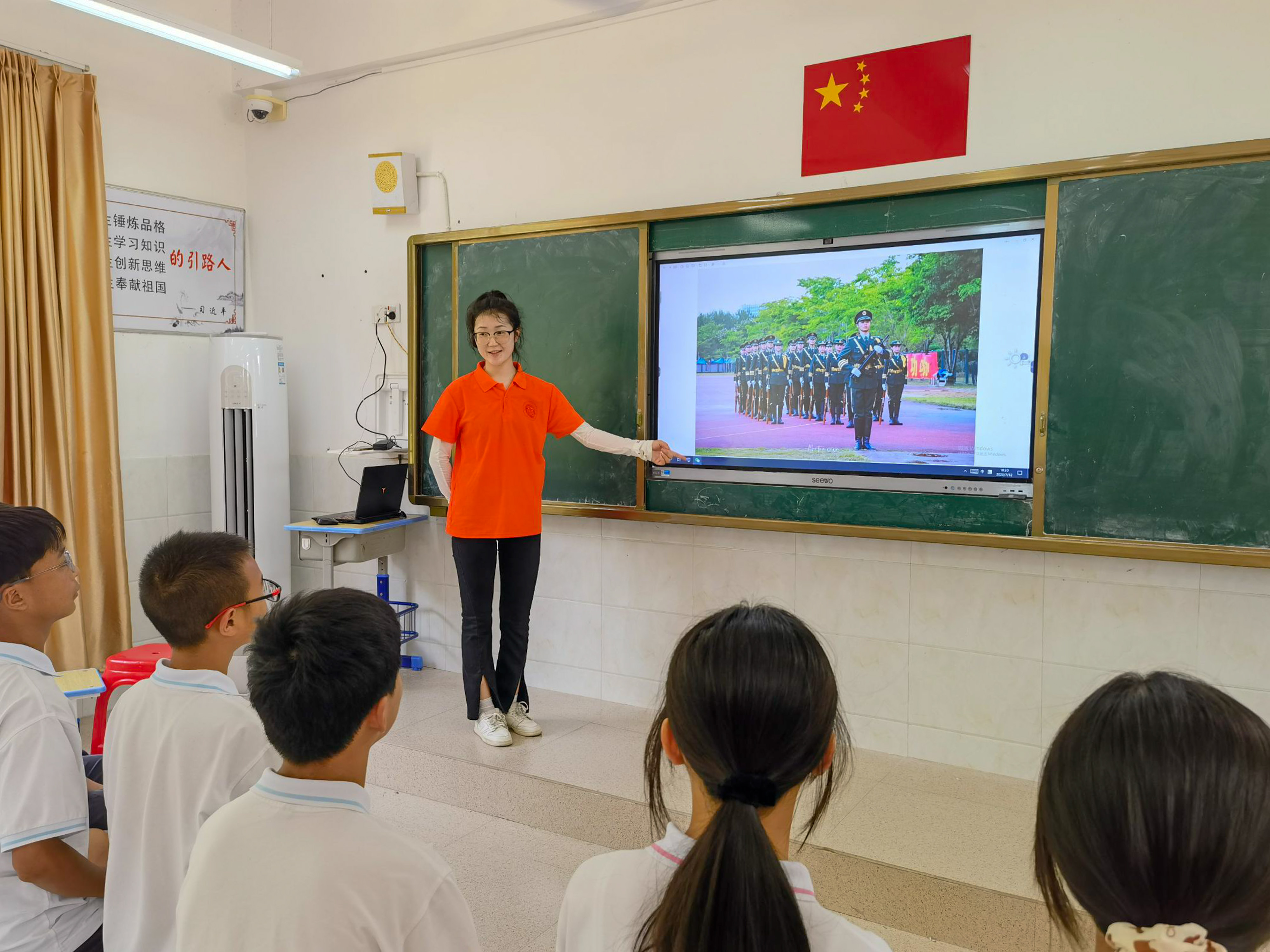 图为古丽米拉向当地少数民族学生展示国旗护卫队风采。福州大学 吴靖 摄